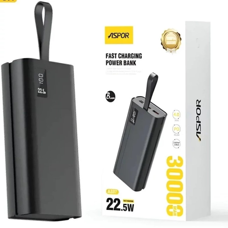 پاوربانک 30000 میلیآمپری ASPOR مدل A337 با شارژ سریع 22.5 وات اگر به دنبال یک پاوربانک پرقدرت با ظرفیت بالا و قابلیت شارژ سریع هستید، پاوربانک ASPOR مدل A337 انتخابی هوشمندانه برای شماست. این پاوربانک با ظرفیت عظیم 30000 میلیآمپرساعت، گزینهای ایدهآل برای سفر، استفاده روزمره و مواقع اضطراری است.