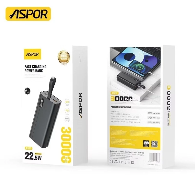 پاوربانک 30000 میلیآمپری ASPOR مدل A337 با شارژ سریع 22.5 وات اگر به دنبال یک پاوربانک پرقدرت با ظرفیت بالا و قابلیت شارژ سریع هستید، پاوربانک ASPOR مدل A337 انتخابی هوشمندانه برای شماست. این پاوربانک با ظرفیت عظیم 30000 میلیآمپرساعت، گزینهای ایدهآل برای سفر، استفاده روزمره و مواقع اضطراری است.